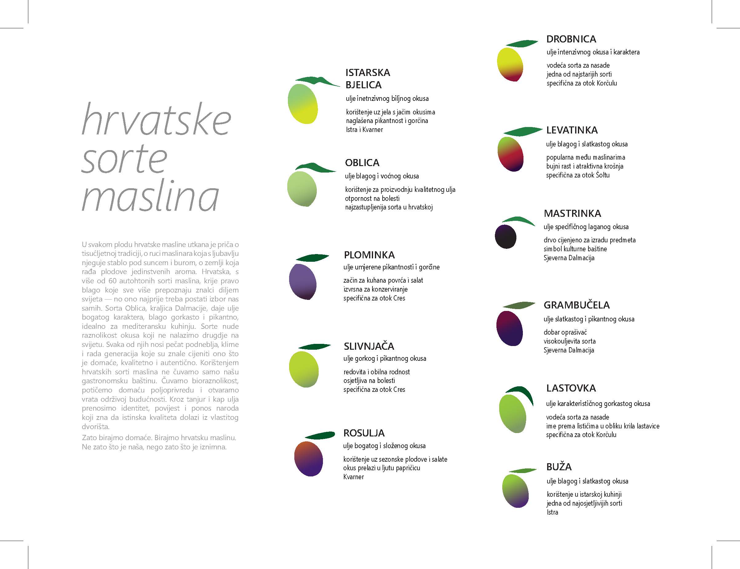 Projekt „Hrvatske autohtone sorte maslina“ interaktivna je platforma koja prikazuje ključne informacije o domaćim sortama: njihova područja uzgoja, okuse ulja, sezonske berbe, namjene, osjetljivost na bolesti i korisna upozorenja za maslinare. Namijenjena širokom krugu korisnika, od laika i entuzijasta do stručnjaka, platforma naglašava važnost hrvatskih sorti te utjecaj podneblja, klime i tradicije. Podaci su prikazani kroz dijagrame i rješenja koja jasno komuniciraju kroz estetski bogate vizuale maslina.