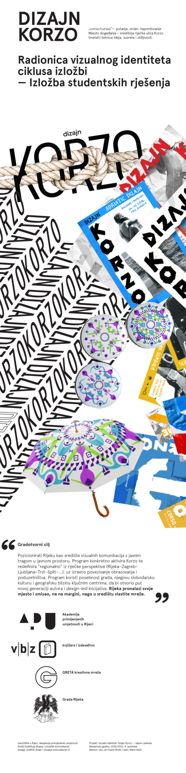 Pozivamo vas danas, 8.4.2026. u 18:30, na otvorenje izložbe Borisa Ljubičića i na otvorenje izložbe studentskih prijedloga rješenja novog ciklusa dizajnerskih izložbi u prostoru SRCE — DIZAJN KORZO, te sutra, 9.4.2026. u 11:00, na predavanje Borisa Ljubičića pod nazivom 'Art & Design', a nakon toga na predstavljanje idejnih rješenja naših studenata i izbor rješenja za realizaciju. Lokacija: SRCE, VBZ (Korzo 9, Rijeka)