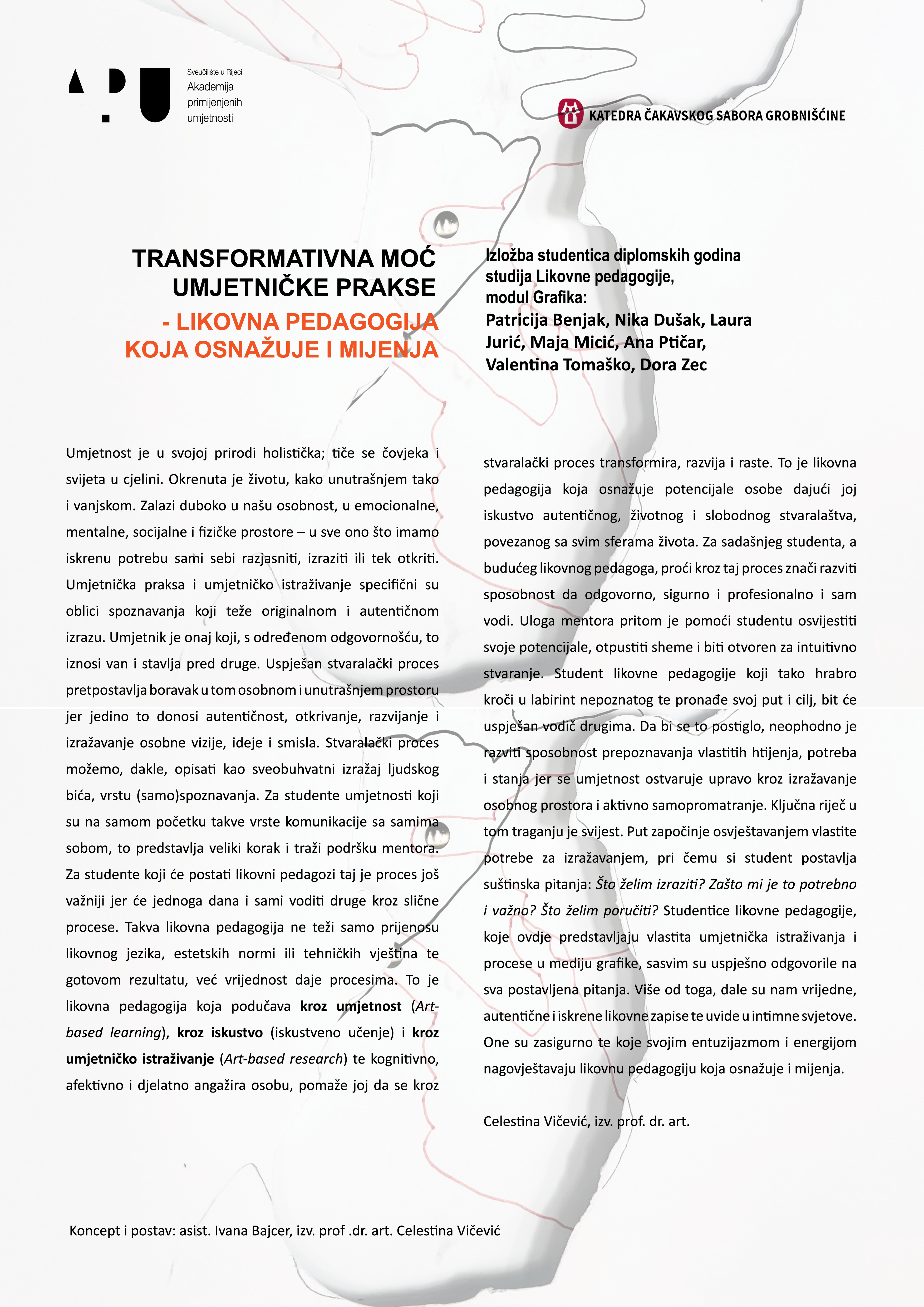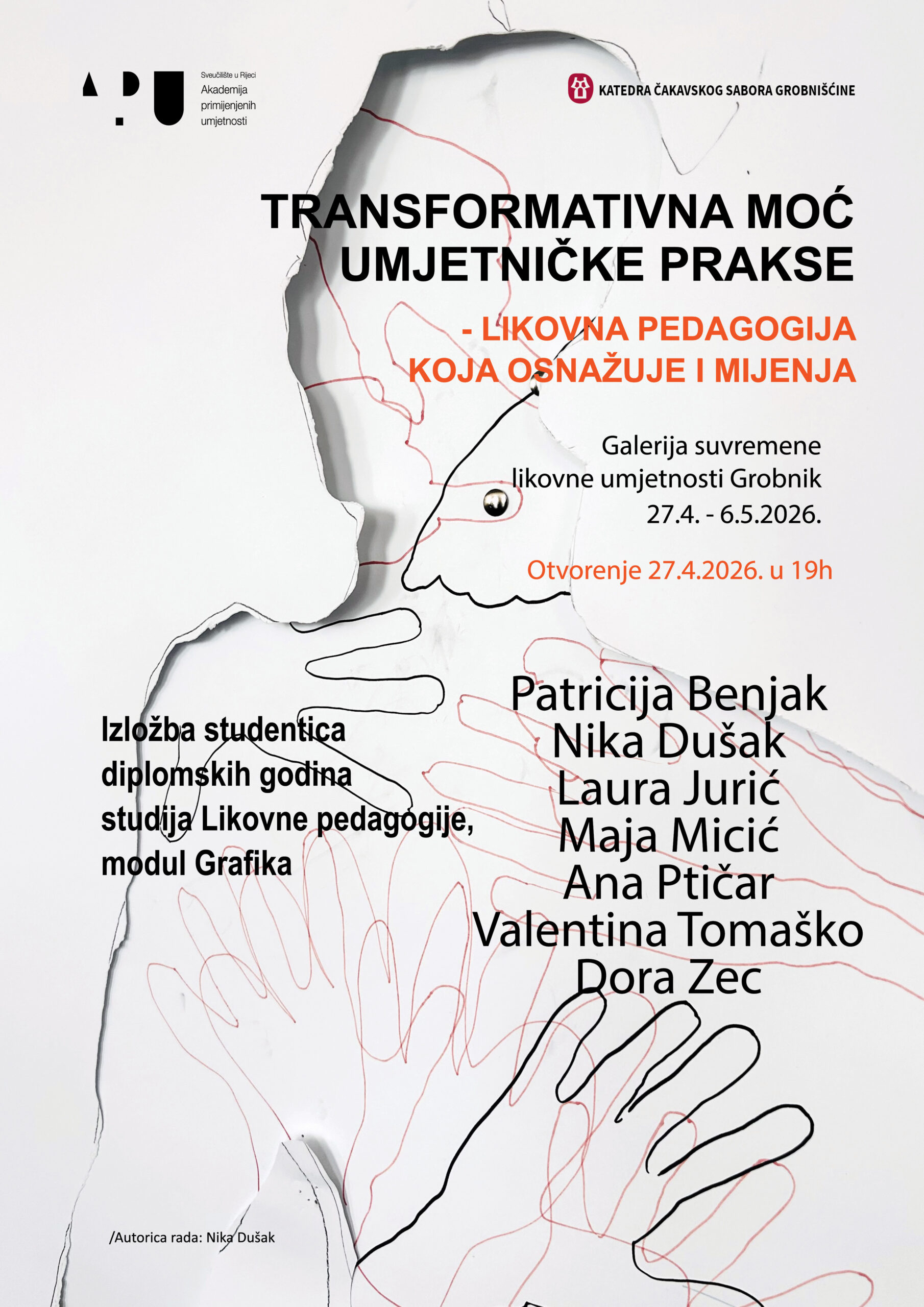 Pozivamo vas na otvorenje izložbe studentica diplomskog studija Likovne pedagogije koje kroz grafiku istražuju odnos umjetničkog procesa i osobnog razvoja. Grafike, knjige umjetnica i objekti jesu oblik njihovog umjetničkog istraživanja, učenja kroz umjetnost i iskustvo te prikazuju autentičan stvaralački put. Ovom izložbom buduće likovne pedagoginje predstavljaju svoj pristup struci – onaj koji potiče promjenu i promatra umjetnost kao alat za osnaživanje. Izlažu studentice: Patricija Benjak, Nika Dušak, Laura Jurić, Maja Mičić, Ana Ptičar, Valentina Tomaško i Dora Zec. Predstavljeni radovi nastali su na kolegijima Grafika A i B, Grafika C i D te Oblikovanje umjetničkih knjiga A, pod mentorstvom izv. prof. dr. art. Celestine Vičević i asistentice Ivane Bajcer. Izložba će se održati u Galeriji suvremene likovne umjetnosti Grobnik od 27.4. do 6.5.2026. Otvorenje je 27.4. u 19 sati.