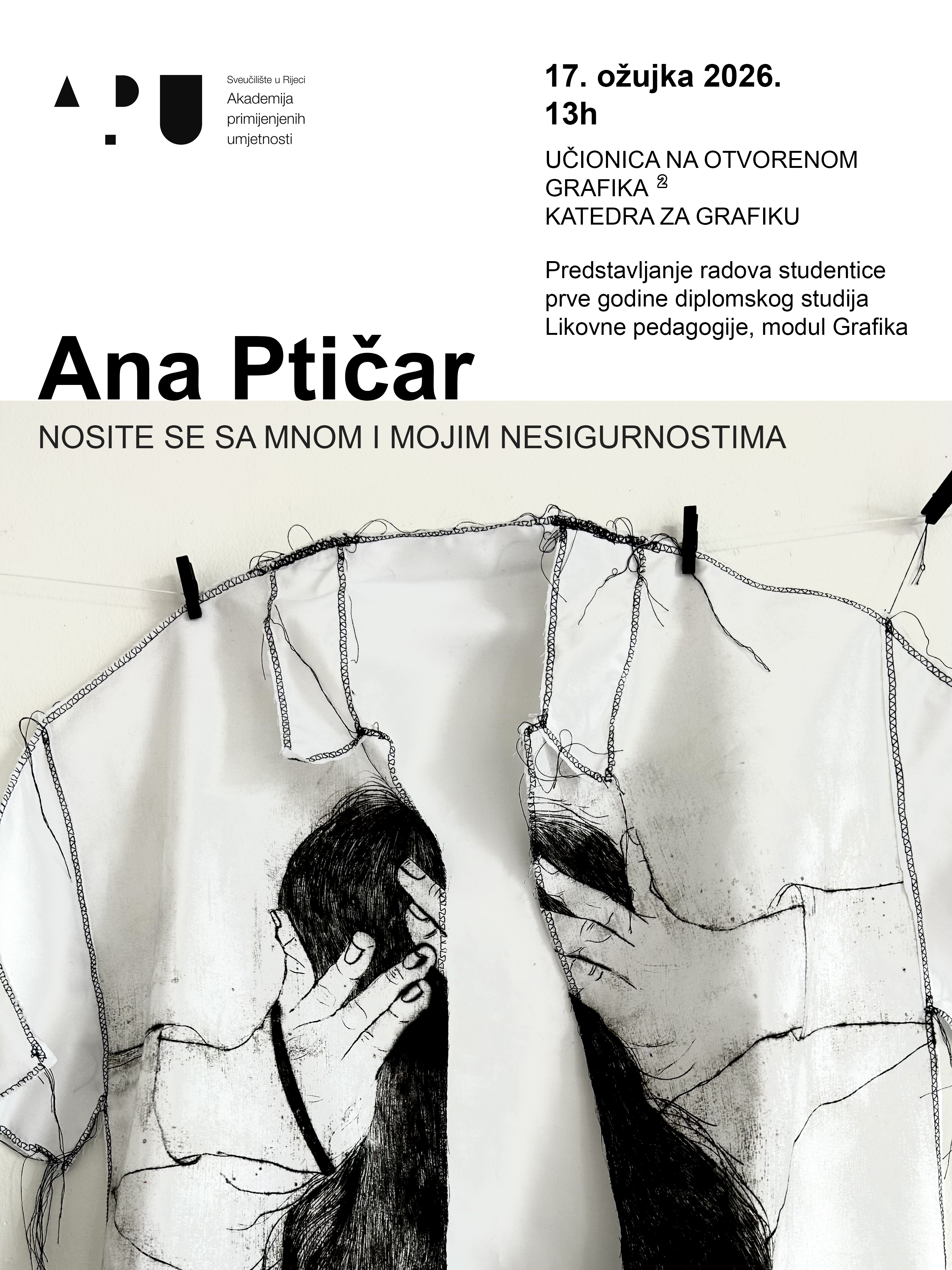 Pozivamo vas na predstavljanje knjiga umjetnice, studentice 1. godine diplomskog studija Likovne pedagogije, modul Grafika. Predstavit će se dvije knjige pod zajedničkim nazivom "Nosite se sa mnom i mojim nesigurnostima", produkti kolegija Oblikovanje umjetničkih knjiga A. Vidimo se u utorak, 17. 3. 2026. u 13 sati, u hodniku Grafike!